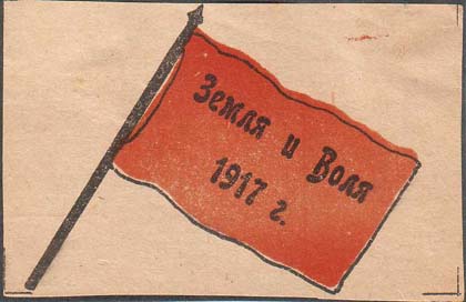 1917 г. Разм. 69 х 44 мм. Двухцветная печать на сероватой бумаге. В центре красное знамя. На полотнище знамени текст в две строки: «Земля и Воля. 1917 г.». По углам знака разграничительные линии.