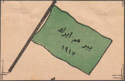 1917 г. Разм. 69 х 47 мм. Двухцветная печать на сероватой бумаге. В центре зеленое знамя. На полотнище знамени текст в три строки на татарском языке арабским шрифтом: «Земля тому, кто сам работает на ней. 1917». По углам знака разграничительные линии.