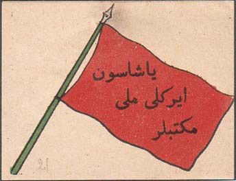 1917 г. Разм. 59 х 45 мм. Двухцветная печать на сероватой бумаге. В центре красное знамя. На полотнище знамени текст в три строки на татарском языке арабским шрифтом.