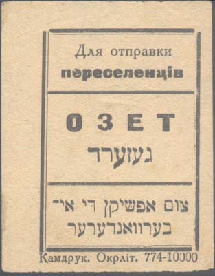 1924(?) г. Разм. 52 х 66 мм. Одноцветная печать на тонкой желто-серой бумаге. В центре в двойной прямо-угольной рамке разм. 39 х 54 мм аббревиатура на украинском языке и на иврите: «ОЗЕТ». Сверху текст в две строки на украинском языке: «Для отправки переселенцев». Внизу текст в две строки на иврите. Внизу под рамкой выходные данные на украинском языке: «Кампечать. Окрлит. 774-10000».
