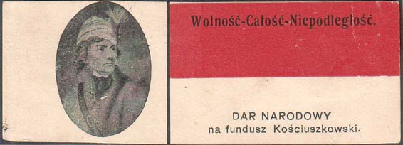 1917 г. 12.10.1917 г. Разм. 93 х 34 мм. Трехцветная печать на толстой белой бумаге. Виньетка поделена вертикальной полосой на две части. В левой в овале портрет Тадеуша Косцюшко. Правая поло-вина в виде польского флага. Справа сверху текст на польском языке: «Свобода – Единство - Независимость». Внизу текст в две строки на польском языке: «Народный сбор на фонд Косцюшко».