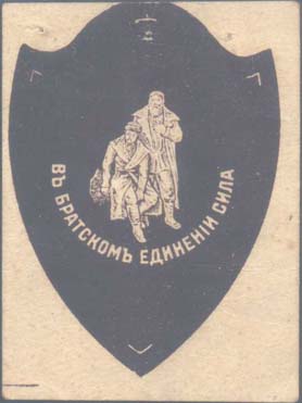 1917(?) г. Разм. 46 х 62 мм. Одноцветная печать на белой бумаге. В центре в рамке в виде щитка сложной формы разм. 42 х 54 мм две фигуры. Внизу полу-кругом текст: «В братском единении сила». По углам знака разграничительные линии.