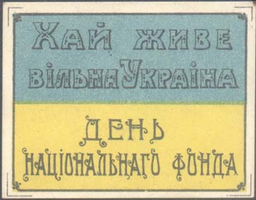 1917(?) г. Разм. 61 х 48 мм. Трехцветная печать на плотной белой бумаге. В прямоугольной рамке флаг Украины. Сверху текст в две строки на украинском языке: «Да здравствует свободная Украина». Внизу текст в две строки: «День национального фонда. По углам знака разграничительные линии.
