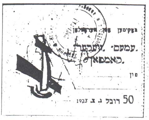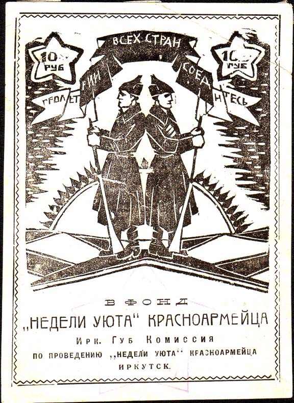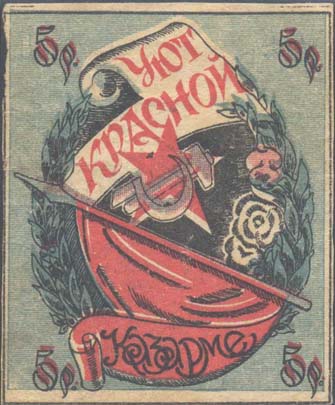 1923 г. Разм. рамки 55 х 66 мм. Трехцветная печать на белой бумаге. В центре в обрамлении венка пятиконечная звезда, серп и молот. Ниже красное знамя. Текст: «Уют красной казарме». Во внутренних углах рамки номинал.