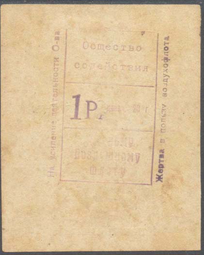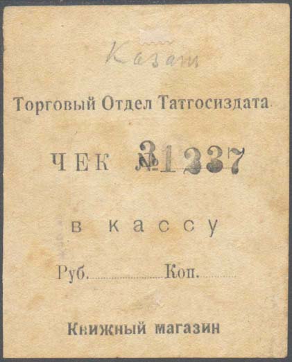 1923 г. Разм. 71 х 86 мм. Одноцветная печать на желтоватой бумаге. На лицевой стороне текст в пять строк: «Торговый Отдел Татгосиздата Чек № .. в кассу Руб... Коп... Книжный магазин». На оборотной стороне фиолетовый оттиск прямоугольного штампа разм. рамки 32 х 53 мм. Прямоугольная рамка штампа разделена на три горизонтальных части. В центре номинал: «1 р. дензн. 23 г.». Сверху текст в две строки: «Общество содействия». Внизу продолжение текста в две строки: «Красному воздушному флоту». Слева от рамки штампа текст снизу вверх: «На усиление деятельности О-ва». Справа от рамки штампа текст снизу вверх: «Жертва в пользу воздухфлота».