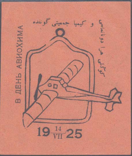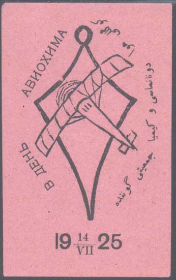 1925 г. 14.07.1925 г. Одноцветная печать на бумаге различных цветов. По периметру текст на русском и татарском (арабским шрифтом) языках: «В день АВИАХИМА». Внизу дата: «19 14/VII 25».