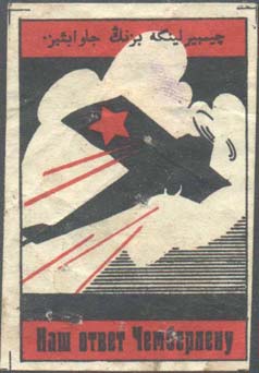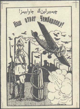1927 г. Разм. рамки 45 х 68 мм. Одноцветная печать на белой бумаге. В прямоугольной рамке в центре красноармеец в противогазе рядом с баллоном с отравляющим веществом на фоне завода. В небе самолеты. Сверху текст на татарском языке арабским шрифтом. Ниже полукругом текст: «Наш ответ Чемберлену!».