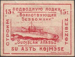 1930(?) г. Разм. рамки 39 х 24 мм. Одноцветная печать на сероватой бумаге. В прямоугольной рамке в центре подводная лодка в надводном положении. Слева и сверху текст: «Строим подводную лодку «Воинствующий Безбожник»» и номинал. Справа и внизу текст на татарском языке латинским шрифтом и номинал. В правом нижнем углу выходные данные мелким шрифтом неразборчиво.