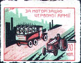 1932 г. Разм. рамки 38,5 х 29 мм. Трехцветная печать на белой бумаге. В центре в прямоугольной рамке дорога, по которой едут грузовик с солдатами в кузове и трактор. Слева индустриальный пейзаж. Справа внизу номинал.
