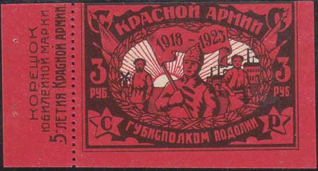 1923 г. Листок из квитанционной книжки разм. рамки 52 х 36 мм. Одноцветная печать на розово-красной бумаге. Левосторонняя зубц. 11 1/2. В центре в овальном венке красноармеец, рабочий и крестьянин на фоне восходящего солнца, поля и завода. Красноармеец в руках держит флаг с датами: «1918-1923». Слева и справа от венка номинал. По внутренним углам рамки буквы аббревиатуры: «С.С.С.Р.». Сверху полукругом текст: «Красной армии». Внизу полукругом продолжение текста: «Губисполком Подолии». На талоне вертикально текст в три строки: «Корешок юбилейной марки 5-летия Красной армии».
