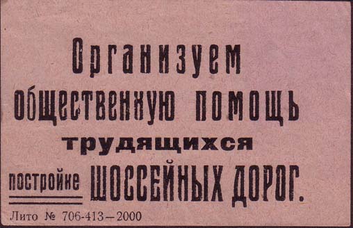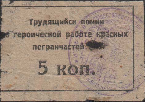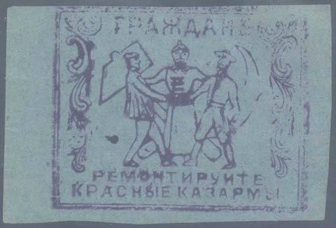 1925(?) г. Разм. рамки 61 х 50 мм. Одноцветная печать низкого качества на зеленовато-серой бумаге. На лицевой стороне фиолетовый оттиск ручного штампа. В двойной прямоугольной рамке в центре рабочий, крестьянин и солдат на фоне серпа и молота. Текст в три строки: «Граждане! Ремонтируйте красные казармы». Слева и справа с внутренней стороны рамки декоративные элементы.