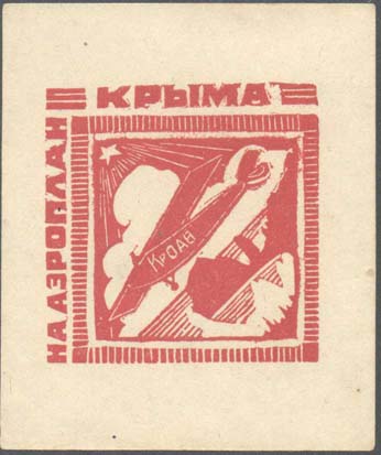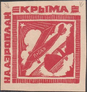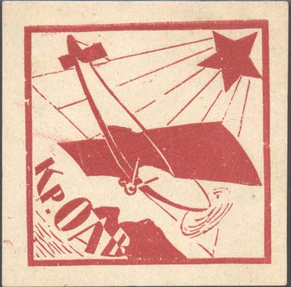 1924(?) г. Ромб разм. рамки 83 х 83 мм. Одноцветная печать на белой бумаге. В рамке самолет над берегом моря. Сверху пятиконечная звезда с лучами. Внизу аббревиатура «Кр.ОАВ».