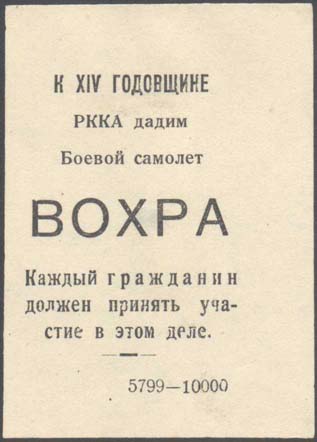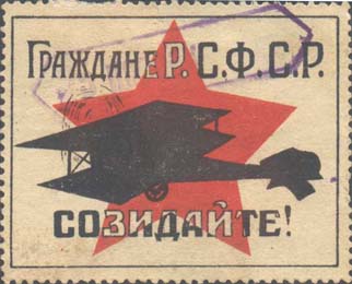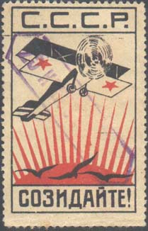 1933(?) г. Разм. 50 х 45 мм. Одноцветная печать на желтой бумаге. В прямоугольной рамке самолет-биплан, летящий влево вверх. В правом верхнем углу пятиконечная звезда и текст в четыре строки: «Крепим Красный Воздушный флот!». В левом нижнем углу пятиконечная звезда и текст в три строки: «Построим аэроплан Горький – Вятка!».