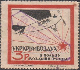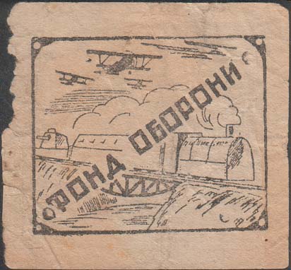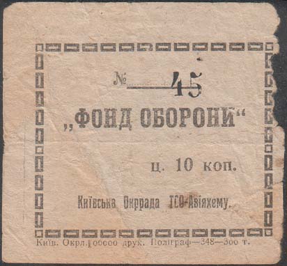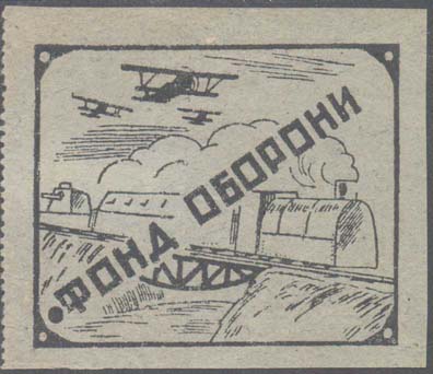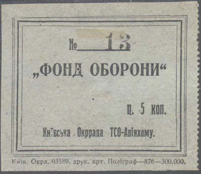 1927 г. Одноцветная двухсторонняя печать на бумаге различных цветов. На лицевой стороне в рамке 56 х 46 мм бронепоезд, идущий по мосту, в небе самолеты и текст по диагонали на украинском языке: «Фонд обороны». На оборотной стороне в центре текст: ««Фонд обороны»». Сверху номер нумератором. Внизу номинал и текст: «Киевский Окрсовет ОСО-Авиахима». Внизу под рамкой выходные данные: «Киев. Окр. 03589 тип. арт. полиграф - 876 - 300000».
