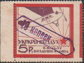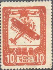 1924 г. Разм. рамки 24 х 32,5 мм. Одноцветная печать на белой бумаге. Зубц. 11 1/2. С клеем. В широкой декоративной рамке самолет-биплан. Вокруг самолета текст: «Красный Костромич». Сверху эмблема ОДВФ. Внизу аббревиатура «К.О.Д.В.Ф.» и номинал в золотой валюте.