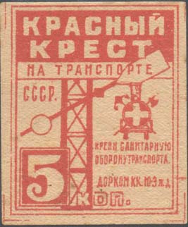 1931 г. Разм. рамки 40 х 50 мм. Одноцветная печать на желтоватой бумаге. В центре механический светофор. Справа в центре паровоз, скрещенные якорь, топор и красный крест. Слева внизу номинал. Сверху текст в четыре строки: «Красный Крест на транспорте СССР». Справа внизу текст в три строки: «Крепи санитарную оборону транспорта. Дорком К.К. Ю-З ж.д.».
