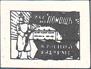 1925 г. Разм. рамки 56 х 39 мм. Одноцветная печать на белой глянцевой бумаге. В прямоугольной рамке на фоне восходящего солнца здание казармы и красноармеец со знаменем. На полотнище знамени текст в четыре строки: «Все на помощь Красной Казарме».