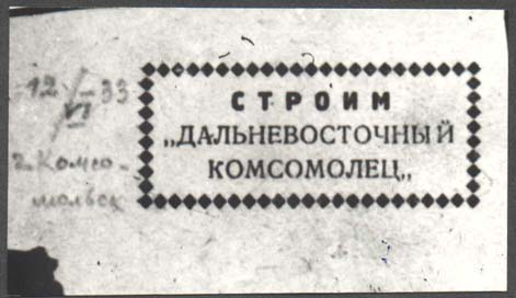 1933 г. 12.06.1933 г. Разм. рамки 52 х 22 мм. Одноцветная печать на желтоватой бумаге. В прямоугольной рамке из ромбиков текст в три строки: «Строим «Дальневосточный Комсомолец»».