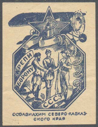 1930(?) г. Разм. 53 х 71 мм. Одноцветная печать на желтоватой бумаге. В центре в восьмиугольной рамке рабочий, крестьянин и красноармеец пожимают друг другу руки. Сверху самолет-биплан, пятиконечная звезда, баллон с газом и лента. На ленте текст: «Крепи оборону СССР». Внизу текст в три строки: «Осоавиахим Северо-Кавказского Края».
