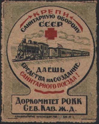 1932 г. Разм. 53 х 68 мм. Трехцветная печать на сероватой рыхлой бумаге низкого качества. В центре круглая рамка диаметром 50 мм, переходящая внизу в прямоугольную рамку. В круглой рамке в центре санитарный поезд. Выше красный крест. Сверху полукругом текст в три строки: «Крепи санитарную оборону С.С.С.Р.». Внизу полукругом текст в три строки: «Даешь средства на создание санитарного поезда!». Внизу в прямоугольной рамке текст в три строки: «Доркомитет РОКК Сев[еро]. Кав[казской]. ж. д.». Внизу мелким шрифтом выходные данные: «Адыглитография. Краснодар. Тир. Зак №7».