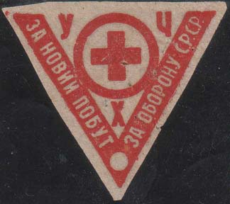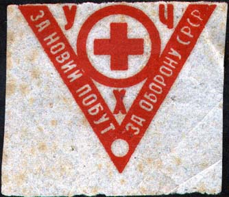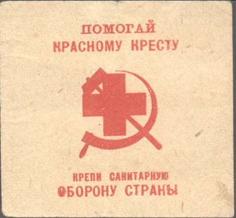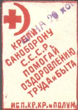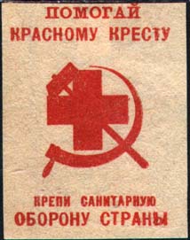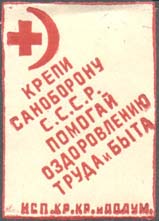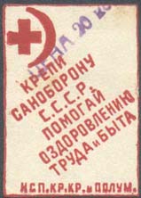 1930(?) г. Разм. 38 х 54 мм. Одноцветная печать на бумаге различных цветов. В центре красный крест на фоне серпа и молота. Текст в четыре строки: «Помогай Красному Кресту. Крепи санитарную оборону страны».