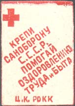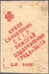 1932 г. Разм. 25 х 36 мм. Одноцветная печать на белой бумаге. В левом верхнем углу красный крест. В центре по диагонали текст в шесть строк: «Крепи саноборону С.С.С.Р. Помогай оздоровлению труда и быта». Внизу текст: «Ц.К. РОКК».