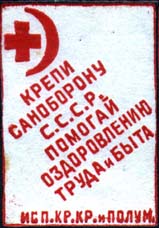 1932 г. Разм. 25 х 36 мм. Одноцветная печать на белой бумаге. В левом верхнем углу красный крест и красный полумесяц. В центре по диагонали текст в шесть строк: «Крепи саноборону С.С.С.Р. Помогай оздоровлению труда и быта». Внизу текст: «Исп[олком]. Кр[асного]. Кр[еста]. и полум[есяца].».