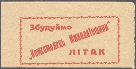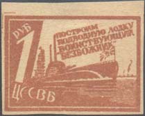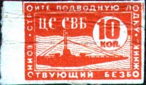 1931 г. Разм. рамка 37 х 25 мм. Двухцветная печать на желтоватой бумаге. С клеем. В центре силуэт подводной лодки в надводном положении. Слева сверху в круглой рамке аббревиатура «ЦС СВБ», справа верху в круглой рамке номинал. Текст в две строки: «Построим подводную лодку «Воинствующий Безбожник»».