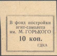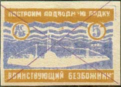1931 г. Разм. рамки 33 х 23 мм. Одноцветная печать на желтоватой бумаге. В центре подводная лодка в надводном положении на фоне порта. Сверху справа наклонно текст в четыре строки: «Построим подводную лодку «Воинствующий Безбожник»». Слева номинал и аббревиатура «ЦС СВБ».