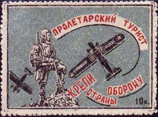 1931 г. Разм. рамки 20,5 х 28, 5 мм. Двухцветная печать на белой бумаге. В центре эмблема ОСОАВИАХИМ, по внутренним углам рамки пятиконечные звезды.