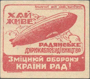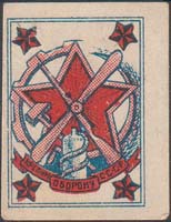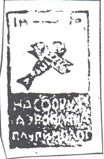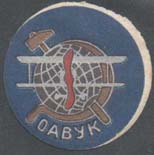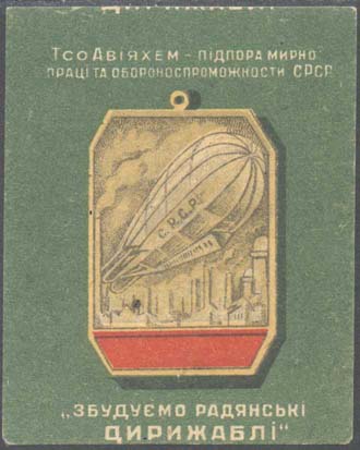1924(?) г. Круг диаметром 24 мм. Многоцветная печать на белой бумаге. На фоне серпа и молота земной шар и самолет-биплан (вид спереди). Внизу аббревиатура «ОАВУК».