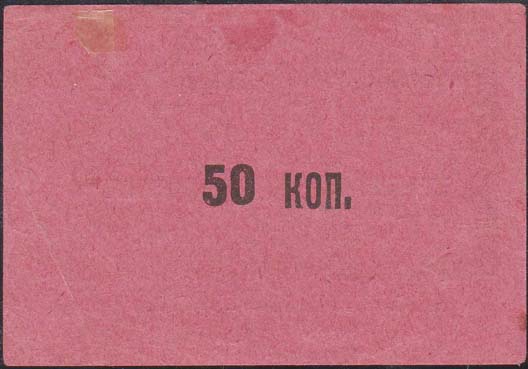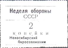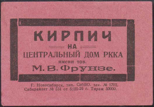 1926 г. 05.03.1926 г. Разм. рамки 72 х 36 мм. Одноцветная двухсторонняя печать на розовой бумаге. На лицевой стороне в толстой прямоугольной рамке в центре текст в пять строк: «Кирпич на Цен-тральный дом РККА им. тов. М.В.Фрунзе». Внизу мелким шрифтом выходные данные: «Г. Новосибирск, тип. СибВО. Зак. №1702 Сибкрайлит. №534 от 5/III-26 г. Тираж 50000». На обороте номинал: «50 коп.».