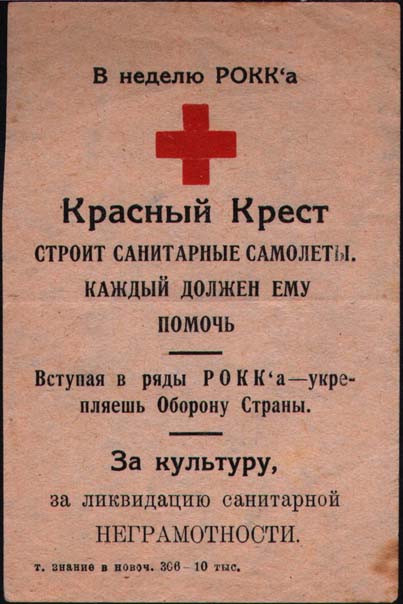1930(?) г. Разм. 68 х 102 мм. Двухцветная печать на бумаге различных цветов. Сверху текст: «В неделю РОККа». Ниже красный крест и текст в четыре строки: «Красный Крест строит санитарные самолеты. Каждый должен ему помочь». Ниже текст в две строки: «Вступая в ряды РОККа – укрепляешь Оборону Страны». Ниже текст в три строки: «За культуру, за ликвидацию санитарной неграмотности». Внизу справа мелким шрифтом выходные данные: «Т. Знание в Новоч. 306 – 10 тыс.».