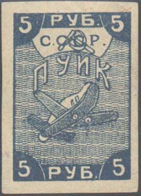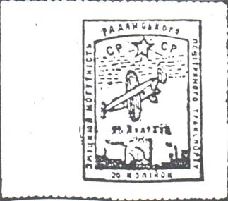 1923 г. Разм. рамки 28 х 40 мм. Одноцветная печать на желтоватой бумаге. В центре самолет, летящий вправо вверх. Сверху в рамке сложной формы серп и молот и аббревиатура «С.С.С.Р.». Под щитом полукругом аббревиатура «ПУИК». По внутренним углам номинал.