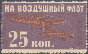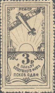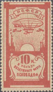 Разм. рамки 25 х 46 мм. Сверху различные рисунки. Внизу номинал и текст в четыре строки: «Р.С.Ф.С.Р. В пользу Воздушного Флота Псков[ское]. О.Д.В.Ф.».