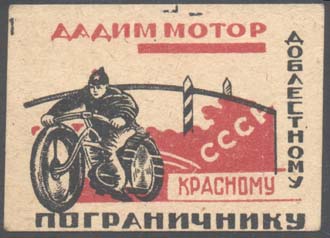 1932(?) г. Разм. 53 х 38 мм. Двухцветная печать на плотной кремовой бумаге. В центре красноармеец на мотоцикле на фоне стилизованного изображения карты СССР и пограничных столбов. Сверху текст: «Дадим мотор». Справа вертикально продолжение текста: «Доблестному». Справа внизу продолжение текста в две строки: «Красному пограничнику».