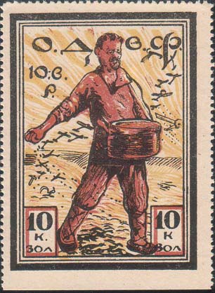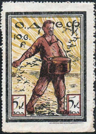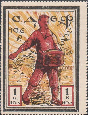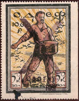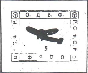1924 г. Республиканский выпуск. Разм. рамки 36 х 25 мм. Одноцветная печать на желтоватой бумаге. Зубц. 11 1/2 и Б.З. В двойной рамке самолет-моноплан, летящий влево. Между линиями рамки дважды повторена надпись: «О.Д.В.Ф. Р.С.Ф.С.Р.».