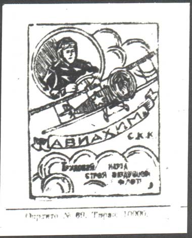 1926(?) г. Разм. рамки 42 х 60 мм. Одноцветная печать на желтой бумаге. В прямоугольной рамке в центре самолет-биплан, летящий вправо. Сверху слева в двойной круглой рамке летчик за штурвалом самолета. Ниже на ленте текст: «АВИАХИМ С.К.К.». Ниже на фоне облаков текст в три строки: «Трудовой народ строй воздушный флот». Внизу под рамкой мелким шрифтом выходные данные: «Окрлит №69, Тираж 10000».