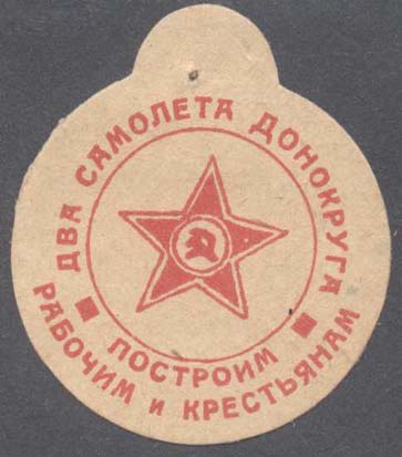 1927(?) г. Виньетка сложной формы в виде круга диаметром 38 мм с ушком сверху. Одноцветная печать на желтоватой бумаге. В центре пятиконечная звезда с серпом и молотом. По окружности текст: «Построим два самолета Донокруга рабочим и крестьянам».
