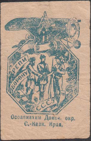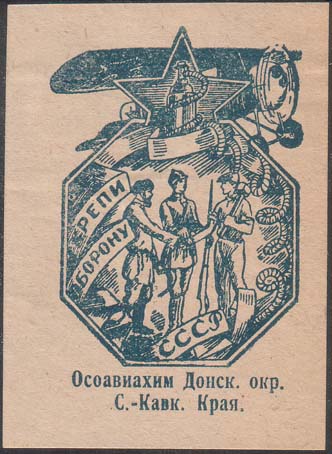 1930(?) г. Разм. 53 х 71 мм. Одноцветная печать на кремовой бумаге. В центре в восьмиугольной рамке рабочий, крестьянин и красноармеец пожимают друг другу руки. Сверху самолет, пятиконечная звезда, баллон с газом и лента. На ленте текст: «Крепи оборону СССР». Внизу текст в три строки: «Осоавиахим Донск[ого]. Окр[уга]. С[еверо].-Кавк[азского]. Края».