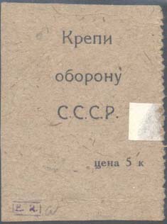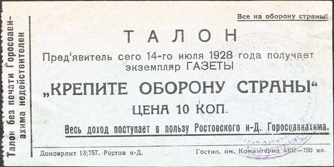 1928 г. Листок из квитанционной книжки разм. 120 х 60 мм. Одноцветная печать на зеленовато-серой бу-маге. Левосторонняя зубц. 11 1/2. В центре текст шесть строк: «ТАЛОН Предъявитель сего 14-го июля 1928 г. получает экземпляр газеты «Крепите оборону страны». Цена 10 к. Весь доход поступает в пользу Ростовского Н_Д Осоавиахима». Сверху справа текст мелким шрифтом в одну строку: «Все на оборону страны!». Внизу под чертой мелким шрифтом выходные данные: «Донокрлит 13/757. Ростов Н-Д. Гостип. Им. Коминтерна 4302 – 750. Слева снизу вверх текст в две строки: «Талон без печати Горосоавиахима недействителен». На лицевой стороне фиолетовый оттиск круглой контрольной печати с неразборчивым текстом.