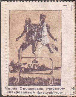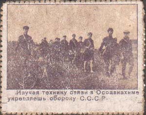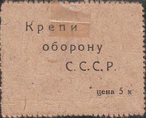1932(?) г. Первый выпуск. Одноцветная и двухцветная двухсторонняя печать на бумаге с мелованным верхним слоем. Нерегулярная зубц. и Б.З. На лицевой стороне в рамках различные рисунки. Внизу пояснительный текст. На оборотной стороне текст в четыре строки: «Крепи оборону СССР. Цена 5 к.». По углам разграничительные линии.
