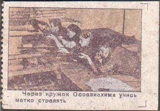 Стрельба в тире. Текст в две строки: «Через кружок Осоавиахима учись метко стрелять».