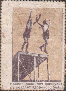 Два человека в противогазах прыгают с подставки. Текст в две строки: «Военизированная физкультура создает здорового бойца».