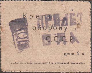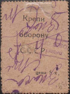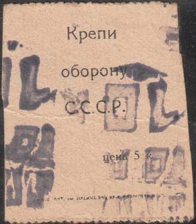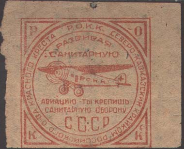 1931 г. Разм. рамки 23 х 32,5 мм. Многоцветная печать на серо-зеленой бумаге с мелованным верхним слоем, тонированным в различные цвета. В двойной прямоугольной рамке в центре эмблема ОСОАВИАХИМ. По углам пятиконечные звезды. Внизу под рамкой слева выходные данные мелким шрифтом: «А 10. 25.-36.». На оборотной стороне оттиск штампа различных цветов разм. 24 х 7 мм. В штампе слева текст в две строки: «С[еверо].-К[авказский]. Крайсов[ет]. Осо-Авиахима». Справа в рамке номинал: «10 к.».