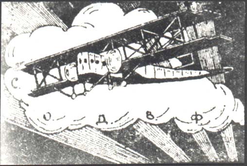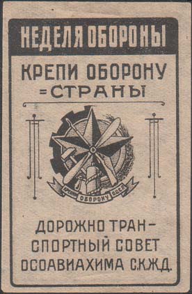 1924(?) г. Разм. 87 х 58 мм. Одноцветная печать на желтоватой бумаге. Самолет-биплан на фоне облака в лучах прожекторов. Текст: «С.О.Д.В.Ф.».