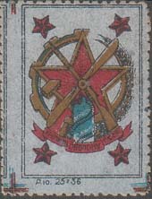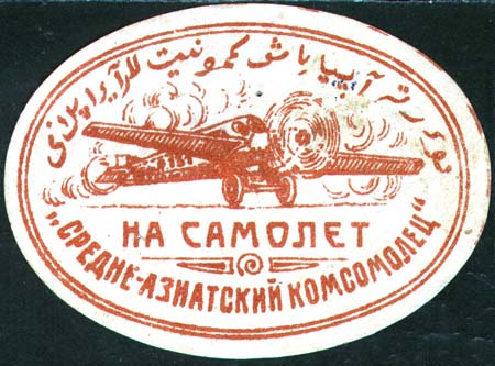 1928(?) г. Овал разм. рамки 70 х 49 мм. Одноцветная печать на толстой белой бумаге. В двойной овальной рамке в центре самолет на фоне облаков. Текст на русском и узбекском (арабским шрифтом) языках: «На самолет «Средне-Азиатский Комсомолец»».