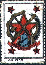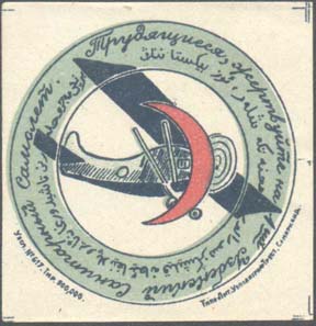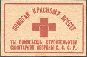 1930(?) г. Разм. 46 х 46 мм. Трехцветная печать на белой бумаге. В центре в двойной круглой рамке диаметром 44 мм самолет и красный полумесяц. Между круглыми рамками текст на русском и узбекском (арабским шрифтом) языках: «Трудящиеся жертвуйте на 1–й Узбекский Санитарный Самолет». Внизу полукругом выходные данные мелким шрифтом: «Узгл. №617, Тир.500000 Узполиграфтрест Самарканд».