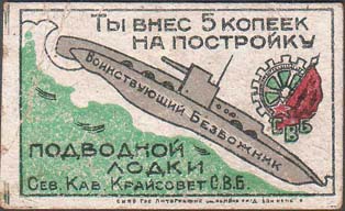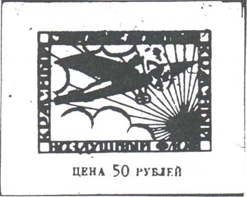 1923 г. Разм. рамки 44 х 31 мм. Одноцветная печать на желтоватой бумаге. В двойной прямоугольной рамке в центре самолет-моноплан, летящий в облаках и пятиконечная звезда с лучами. По периметру между рамками текст: «Стройте мощный красный воздушный флот». Внизу под рамкой номинал: «Цена 50 рублей».