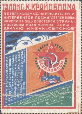 1933 г. Разм. рамки 48 х 66 мм. Многоцветная двух-сторонняя печать на толстой белой бумаге. Зубц. 11 1/2. На лицевой стороне в рамке в лежащем наклонно ромбе значок Всероссийского общества помощи инвалидам войны (Всерообпом). Над ромбом летящие в облаках самолеты-бипланы. Над рамкой текст: «Талон Крайобпома». Ниже текст в пять строк: «В ответ на замыслы вредителей и интервентов поджигателей войны укрепим мощь Советской страны, построим воздушную эскадрилью имени «Обпомов»». В центре слева вертикально текст в семь строк: «Помогать Красной Армии всем, чем только может помогать каждый, - таков первый, основной и главнейший долг всякого сознательного рабочего и крестьянина (Ленин)». Справа внизу текст в четыре строки: «Каждая копейка на дело помощи инвалиду войны есть удар по врагам Советской власти». Но оборотной стороне номинал и текст вертикально в пять строк: «Товарищ ... Ты внес на постройку военно-санитарной эскадрильи им. «Обпомов» Сев[еро]. Кав[казский]. Крайобпом». Под текстом выходные данные мелким шрифтом: «С.К.П.О. Гос. Литография им. Ильича Р.н/Д, зак. N 58. Тираж 5.000.000».